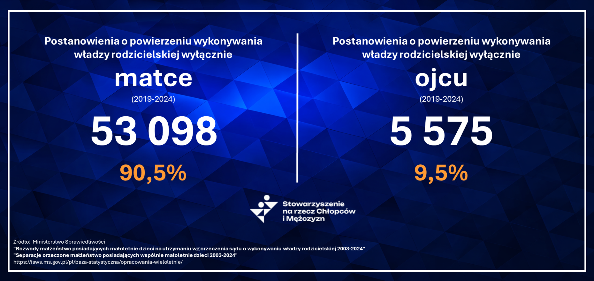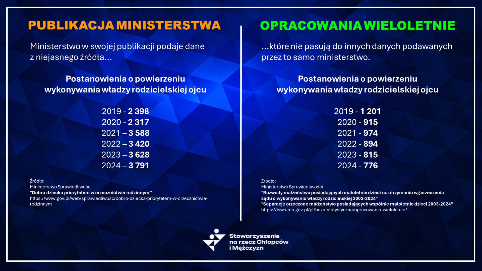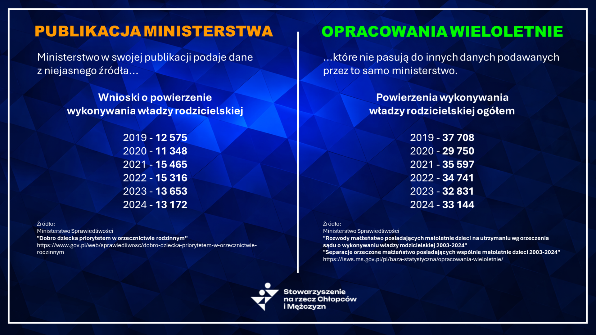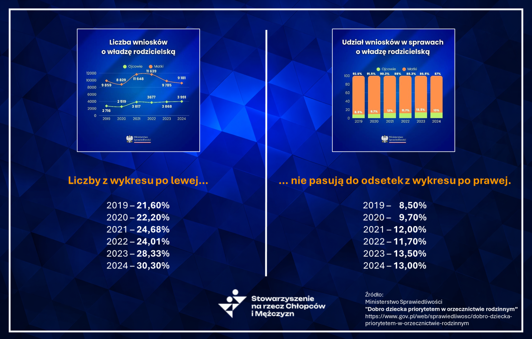 Z danych publikowanych przez ministerstwo, miałoby wynikać jakoby w latach 2019-2024 ojcowie mieli składać rocznie pomiędzy 2519 a 3991 wniosków o powierzenie władzy rodzicielskiej, podczas gdy matki miały składać pomiędzy 8829 a 11639 takich wniosków.